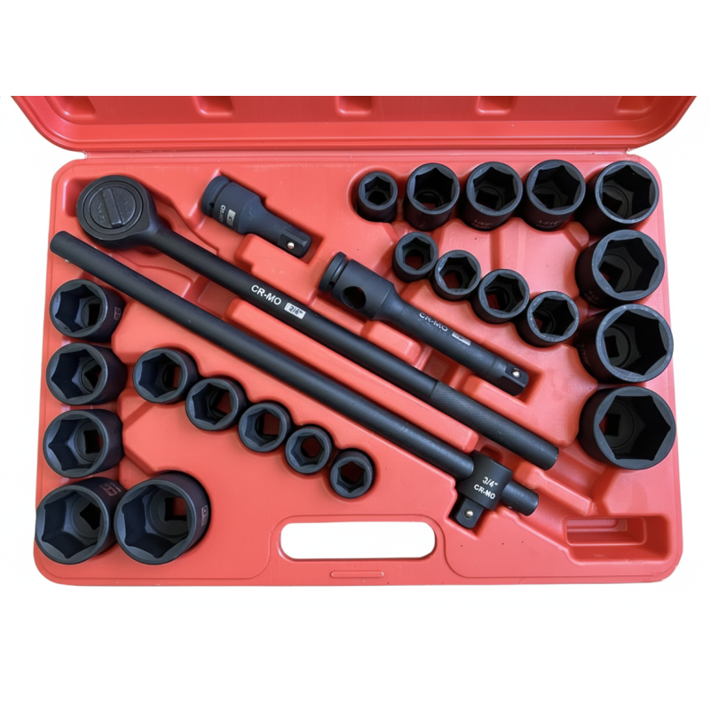 This 26PCS sockets set is designed for the toughest jobs, this 3/4-inch drive impact socket set is the ultimate tool for professional mechanics, truck repair technicians, and industrial workers. Forged from high-strength Chrome Molybdenum (Cr-Mo) steel, it is specifically engineered to handle the extreme vibrations and high-torque demands of impact wrenches.